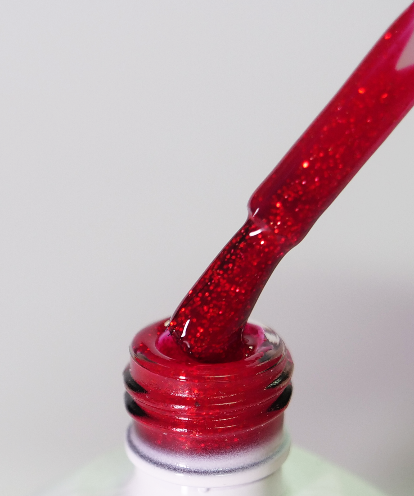 Lakier hybrydowy brokatowy #406 Top Class - klasyczna czerwień z dużą ilością brokatu. Kolor ten jest delikatnie transparentny.